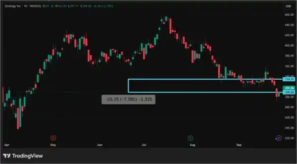 Друге місце дістається компанії Strategy (колишній MicroStrategy), що володіє найбільшим серед публічних організацій резервом біткоїну, з ринковою капіталізацією $87,7 млрд. Акції MSTR продовжили падіння у вересні 2025 року, знизившись на 7,58%. Перша половина місяця склалася для Strategy успішно. Однак з моменту, коли почав коригуватися біткоїн, подешевшали й акції MSTR. Кореляція не дивна з огляду на те, що центральне місце в бізнес-стратегії Strategy займає накопичення BTC.