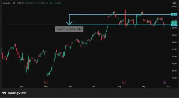 Платіжний сервіс Block (колишній Square), що займається інвестиціями в біткоін, а також інтегрував криптовалюти у свої програми Square і Cash App, розташувався на шостому місці з ринковою капіталізацією $44,9 млрд. У вересні 2025 його акції знизилися на 7,5%. Основною причиною падіння став розпродаж цінних паперів Block керівництвом. Спочатку 4 вересня глава екосистеми компанії Брайан Грасодонія (Bryan Grassodonia) позбавився 9760 акцій. 18 вересня фінансовий та операційний директор Block Амріта Ахуджа (Amrita Ahuja) продала 6581 цінний папір. Обидві транзакції відбулися згідно із заздалегідь встановленим компанією планом, тому корекція виявилася помірною.