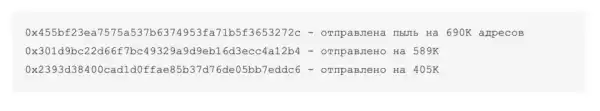 Сергєєнков зміг виявити ймовірні адреси-розподільники завдяки двом критеріям: вони отримували менше одного долара як першу транзакцію зі стейблкоінами, а також відправляли кошти більш ніж на 10 000 адрес кожен. Деякі з найактивніших розподільників провели атаки понад 400 000 одержувачів. Найбільший гаманець прямо зараз відправляє криптопил на 78 000 гаманців щодобово.