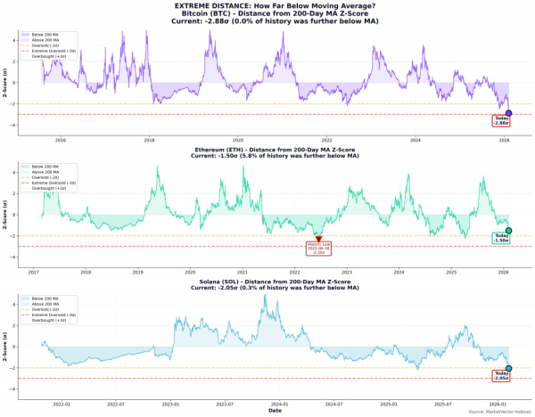 Біткоїн опустився на 2,88 стандартних відхилення нижче своєї 200-денної простої ковзної середньої (SMA). За 10 років такого спостереження ніколи не відбувалося — ні під час пандемії COVID-19, ні під час краху біржі FTX.