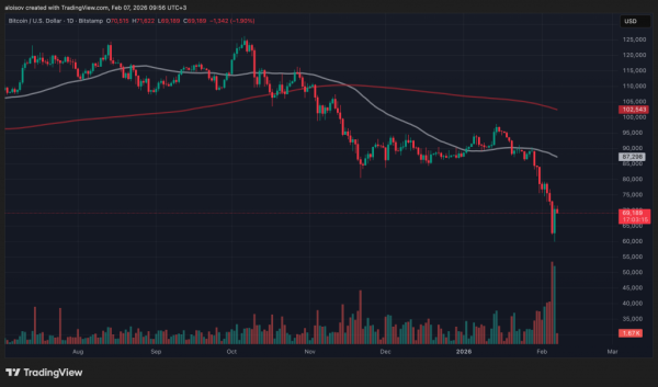 Біткоїн відскочив до $71 673 на біржі Bitstamp — це понад 19% зростання після драматичного падіння напередодні нижче за $60 000. Однак перша криптовалюта поки не змогла закріпитися вище цього рівня на денному таймфреймі, що ставить під питання стійкість відновлення.