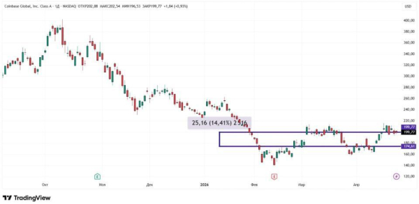 На третьому місці розташувалася найбільша американська криптобіржа Coinbase, ринкова капіталізація якої = $52,75 млрд. У квітні акції компанії зросли на 14,41%. Цьому сприяли ослаблення напруженості на Близькому Сході, позитивні зрушення у просуванні законопроекту про прибутковість стейблкоїнів Clarity та зростання вартості біткоїну. Крім того, Coinbase продовжила свою світову експансію, отримавши австралійську ліцензію ASFL. Документ дозволить компанії пропонувати мешканцям цього континенту ф'ючерси із кредитним плечем на криптовалюту та акції.