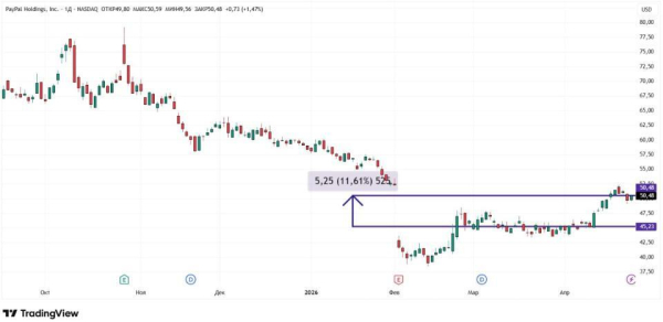 Платіжний сервіс PayPal, який надає своїм клієнтам можливість розплачуватись криптовалютою та має власний стейблкоїн PYUSD, опинився на четвертому місці з капіталізацією $45,41 млрд. Акції PYPL за квітень зросли на 11,61%. Позитивна динаміка багато в чому спричинена партнерством PayPal з американською Національною футбольною лігою (NFL). Вболівальники, які користуватимуться послугами платіжного сервісу, зможуть отримати низку преференцій у вигляді доступу до розіграшів квитків, віп-місць та ексклюзивних акцій.