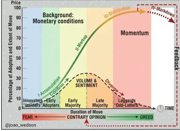 Ведсон зазначив, що крипторинок проходить черговий етап зниження довіри до активів. Він виділив чотири стадії ринкового циклу: