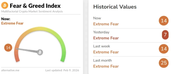 Криптовалютний індекс настроїв знаходиться у зоні «екстремального страху» (14 пунктів). 7 лютого показник опускався до 6.