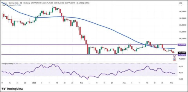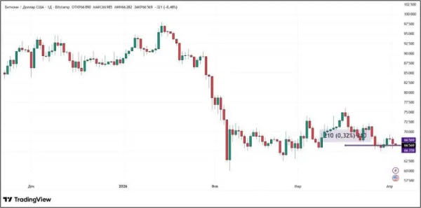 Біткоїн з 27 березня по 3 квітня 2026 року майже не змінився в ціні, додавши 0,32%. Торги активом йшли минулого тижня у досить вузькому діапазоні між $65 000 і $69 000. Психологічно важливу позначку $70 000 найбільшої капіталізації криптовалюті подолати на тижні не вдалося.