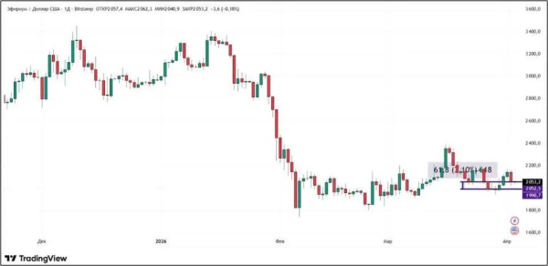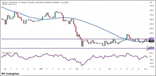 Ефір за сім днів з 27 березня до 3 квітня зріс на 3,1%. Цьому сприяли три торгові сесії зростання у середині тижня. З 30 березня по 1 квітня друга капіталізація криптовалюта піднялася більш ніж на 9%. Але в решту днів динаміка була негативною.