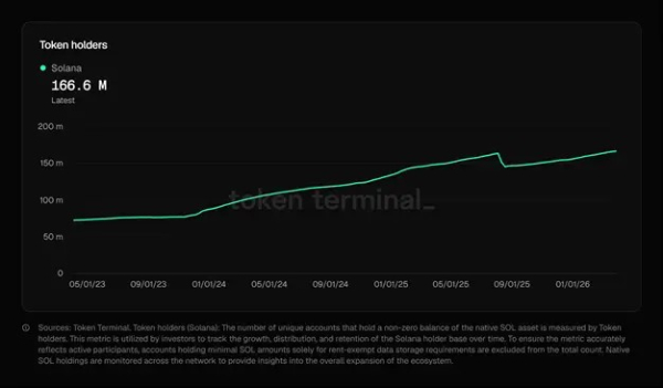 Продовжує зростати загальна кількість власників $SOL . За даними сервісу TokenTerminal, на початок квітня воно вперше перевищило 166 млн. З кінця березня 2025 року кількість холдерів $SOL збільшилася більш ніж на 18 млн. грн.