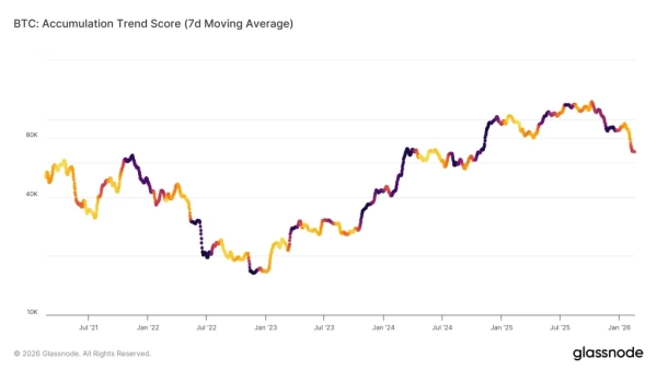 Показники накопичення трохи покращали, але апетит великих власників залишається слабким. Індекс Accumulation Trend Score завмер у нейтральній зоні (~0,4), що говорить про припинення скидання, але не про повернення впевненості китів.