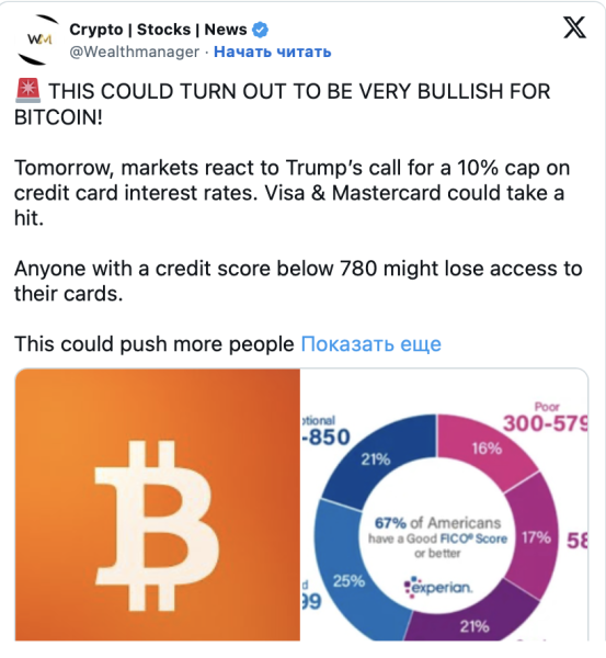 Завтра ринки покажуть свою реакцію на пропозицію Трампа обмежити відсоток за кредитками 10%. Це здатне помітно вплинути на Visa та Mastercard», – написав аналітик Crypto Rover.