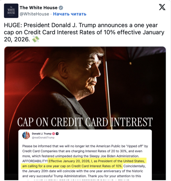 Технічні чинники можуть збігтися з потужним макроекономічним каталізатором. Йдеться про недавню пропозицію президента Дональда Трампа законодавчо обмежити ставки за кредитними картками рівнем 10%. Захід повинен набути чинності 20 січня 2026 року.