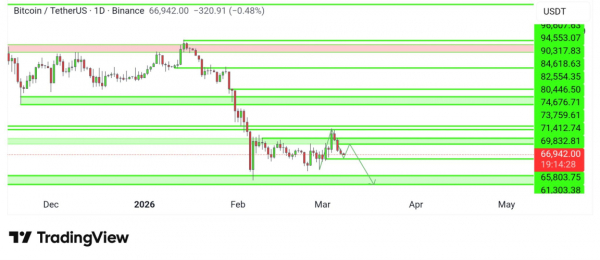 Після того як 4 березня біткоїн піднімався вище за $74 000, монеті не вдалося утримати ключові рівні: за три наступні дні курс втратив 7,6%, а аналітики вказують на ризик подальшого зниження — аж до $61 000.