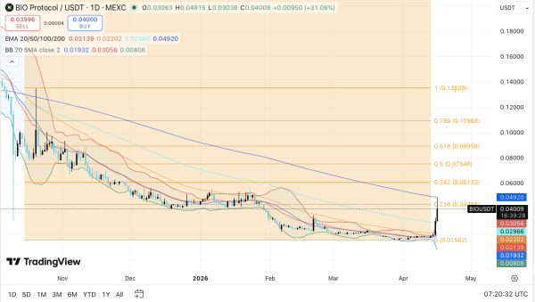 Bio Protocol ( $BIO ) увійшов у фазу високої волатильності після різкого ралі, що підняв ціну до $0.040. Цей крок пішов за тривалим низхідним трендом, коли ціна залишалася нижчою за основні EMA протягом декількох місяців.