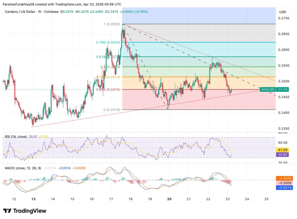 $ADA торгується на рівні $0,2474 23 квітня, збільшившись на 0,16%, перебуваючи на рівні Фібоначчі 0,236, оскільки Input Output скорочує запит на громадське фінансування вдвічі до $46,8 млн, а фізична дебетова карта Cardano Visa того ж дня запускається.