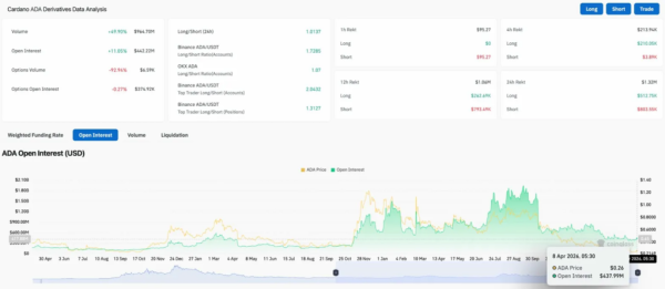 Обсяг ф'ючерсів виріс на 49,90% до $964,70M, а OI виріс на 11,05% до $442,22 млн, обидва виросли разом і підтвердили нові позиції, а не закриття позицій. За 24 години шорти поглинули $803,55K у ліквідаціях проти $512,75K для довгих, при цьому шорти отримали більше проблем у день, коли $ADA очистила свій кластер EMA.