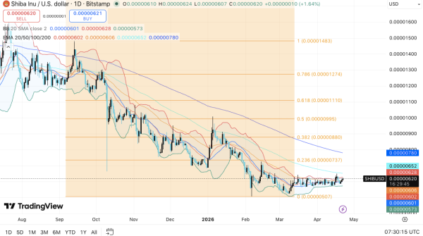 Ключові рівні залишаються чітко визначеними, оскільки Shiba Inu консолідується у недавніх мінімумів діапазону. Ціна продовжує торгуватися нижче основних ковзних середніх, підтверджуючи ширший ведмежий тренд. Однак посилення цінового руху вказує на раннє накопичення та можливу стабілізацію.