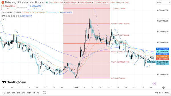 Shiba Inu продовжує торгуватися під тиском, оскільки 4-годинний графік сигналізує про ведмежу на нейтральну структуру. Ціновий рух залишається обмеженим нижче за ключові ковзні середні, що дозволяє продавцям контролювати ситуацію. В результаті трейдери тепер зосереджуються на тому, чи зможе $SHIB захистити короткострокові умови підтримки або ризикувати глибшим падінням.