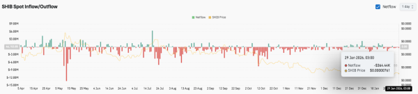 Ключові рівні залишаються чітко визначеними, оскільки Shiba Inu рухається з кінця січня до лютого, при цьому ціновий рух показує стиск після тривалого зниження. $SHIB продовжує торгуватися нижче основних ковзних середніх, зберігаючи обережність короткострокового імпульсу. Однак діапазон, що звужується, говорить про те, що волатильність може збільшитися в міру наближення лютого.
