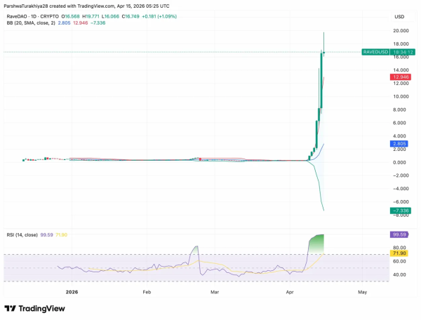 Денна діаграма не потребує технічного аналізу, щоб розповісти історію. $RAVE торгувався на рівні близько $0.20 із січня до початку квітня, при цьому Bollinger Bands стиснули верхню зону на рівні $12.946, середню — $2.805 і нижні — $7.336, майже перекриваючись. Квітневий стрибок підняв ціну до сесійного максимуму $19,771, після чого встановився на рівні $16,74, торгуючись майже на $4 вище верхньої смуги Болінгера.