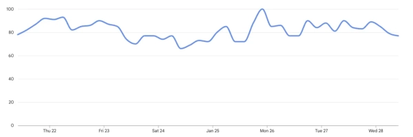 Однак дані Google Trends підтверджують стійкий інтерес до криптоіндустрії. Пік популярності запиту crypto припав на 25 січня, досягнувши максимальних 100 балів.