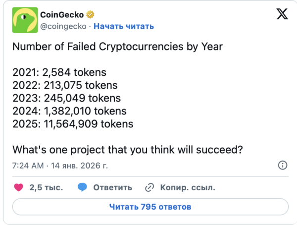 2025 року криптовалютний ринок зіткнувся з безпрецедентною хвилею закриття проектів. За даними аналітичної платформи CoinGecko, за дванадцять місяців припинили існування понад 11,6 млн. токенів.