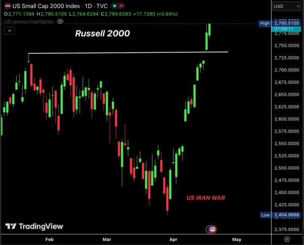 Тим часом малі компанії зросли на 12% лише цього місяця і більш ніж на 16% від військових мінімумів близько 2404 доларів під час розпродажу конфлікту з Іраном.