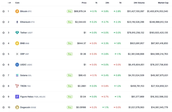 Монети з топ-10 з капіталізації рушили за двома провідними криптовалютами. Загальна ринкова вартість сектора піднялася на 3,2% – до $2,4 трлн.