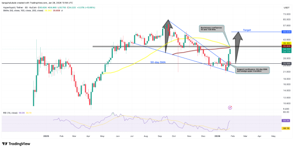 Тим часом $HYPE підтвердив пробою багатомісячної моделі низхідного клина – фігури, яку зазвичай розглядають як сигнал бичачого розвороту.
