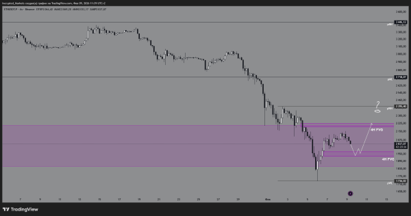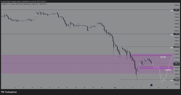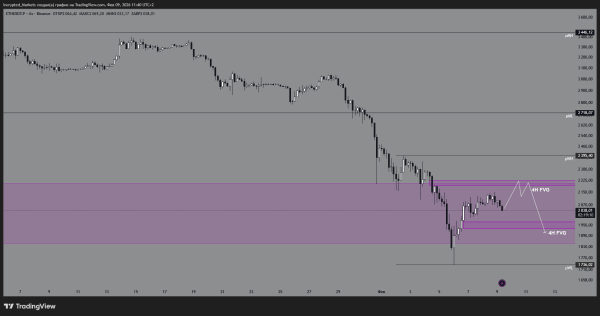 Очікуємо локальний відкат у зону $1900-1950 (тест 4H FVG), формування вищого мінімуму (HL) та рух до тесту пробитого дзеркального рівня $2200. У разі успіху ціль зміщується до $2400.