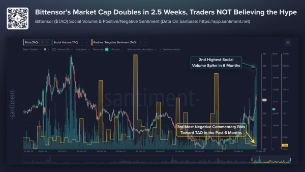 Обсяг обговорень у X , Reddit та Telegram зріс до другого за величиною рівня за останні шість місяців. Вище він був тільки в момент ажіотажу, коли $TAO досягав $529 у листопаді.