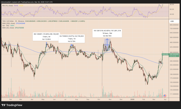 - $TAO формує золотий хрест, який у минулому в середньому призводив до падіння приблизно на 40% .