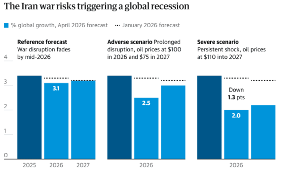 У своєму звіті World Economic Outlook Міжнародний валютний фонд заявив про різко негативну реакцію фінансових ринків, зростання інфляційних очікувань і ризик глобальної рецесії. Такий сценарій в організації вважають можливим результатом подальшої ескалації геополітичної ситуації на Близькому Сході.