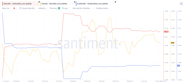 Дані аналітичної платформи Santiment відбивають широку картину розподілу. Власники гаманців з балансом від 100 000 до 1 млн . $AAVE скоротили свої позиції. Їхній сукупний обсяг впав з 7,45 млн до 6,49 млн токенів з кінця лютого. Чистий продаж токенів $AAVE склав близько 960 000 монет.