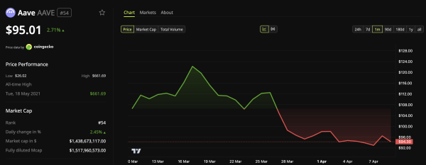 Токен $AAVE падав до внутрішньоденного мінімуму $85.05 сьомого квітня. Це найнижчий рівень із жовтневого обвалу. Пізніше актив торгувався близько $95. Вартість зросла приблизно на 2% разом із рештою ринку. Причиною стали новини про двотижневе припинення вогню між США та Іраном. Здатність покупців зберегти це зростання поки що залишається невідомою.