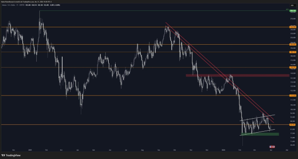 За даними компанії, першим значним рівнем опору у висхідному русі є $85. Цей рівень вважається критичним, оскільки він являє собою горизонтальну зону опору, так і область, де поточний низхідний тренд продовжує чинити тиск. Рівень $98 вважається останнім мінімумом, і аналітики вважають, що прорив вище за цей рівень може значно покращити технічний прогноз. У більш широкому сенсі, рух вище $117 зміцнить структуру відновлення Солани та додасть якості висхідному тренду.