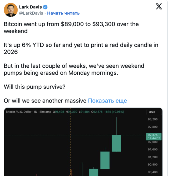 Проте вартість першої криптовалюти різко відновилася. За вихідні курс піднявся з $89 000 до $93 300. Цьому сприяли ліквідації коротких позицій із кредитним плечем та геополітичні чинники, включаючи удари США по Венесуелі. Аналітики відзначають важливу деталь. Зростання вихідного дня часто нівелюється на торгах у понеділок. Це ставить під сумнів стійкість імпульсу початку 2026 року.