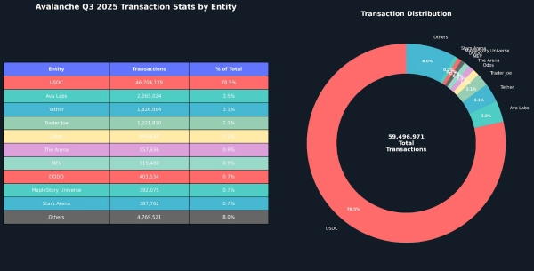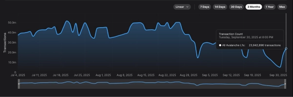 Дані щодо блокчейну Avalanche свідчать про помітну активність користувачів: в середньому більше 1 000 000 транзакцій на день, а найвище значення 51 600 000 транзакцій на день було зафіксовано в останньому триместрі, згідно з інформацією Nansen.