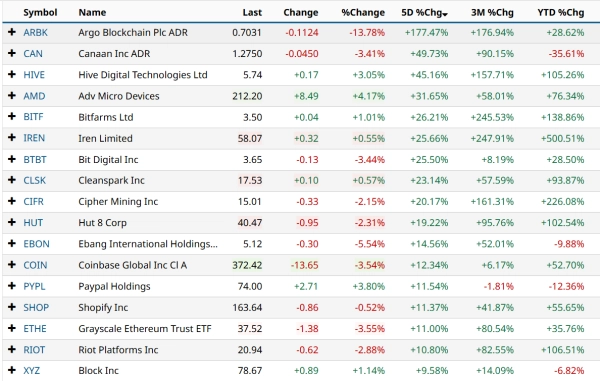 Підбірка акцій компаній, пов’язаних з криптовалютами та блокчейном, включаючи видобуток біткоїнів, біржі та платіжні платформи. Джерело: Barchart.